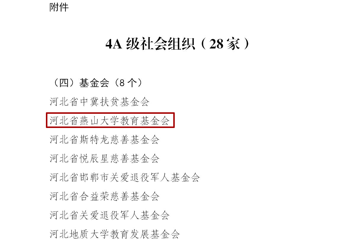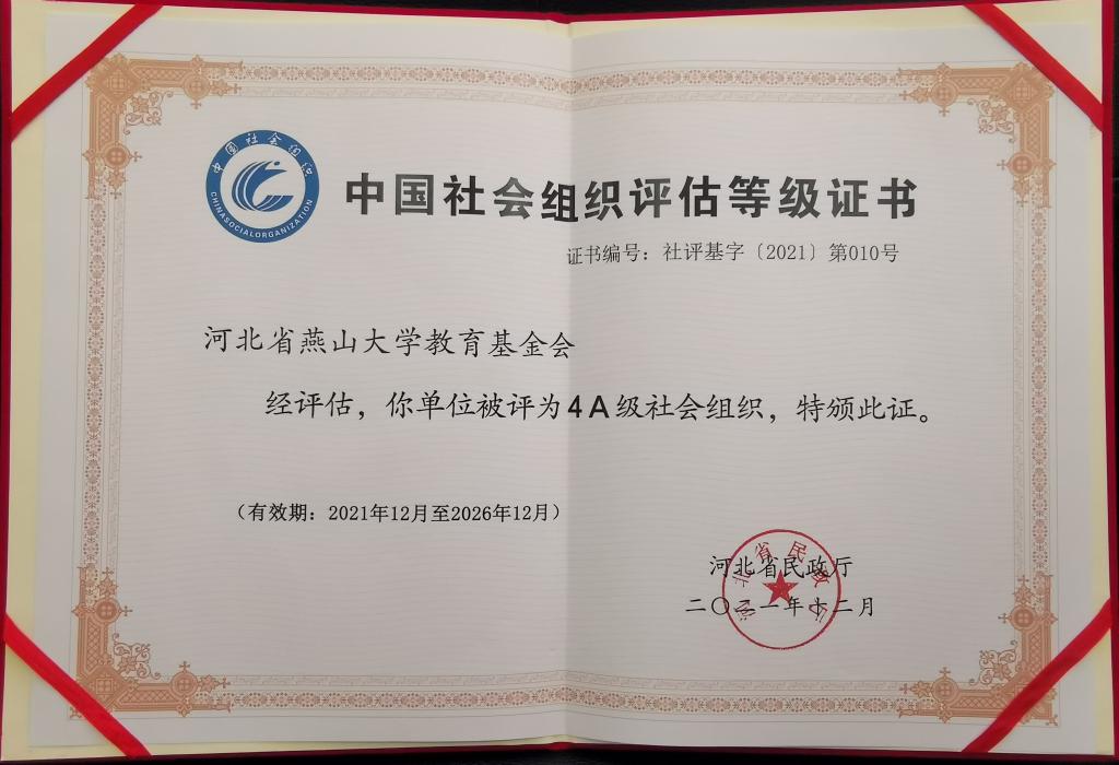【新闻中心讯】在河北省民政厅组织开展的2021年度社会组织评估工作中,经社会组织自评,业务主管单位(设区市)初评,省评估办材料审核、实地检查、省评估委员会终审及媒体公示、受理复核等程序,河北省乐竞(中国)一站式服务官网教育基金会被评为4A级社会组织。3月1日,基金会收到了省民政厅颁发的中国社会组织评估4A等级证书和4A级社会组织牌匾。