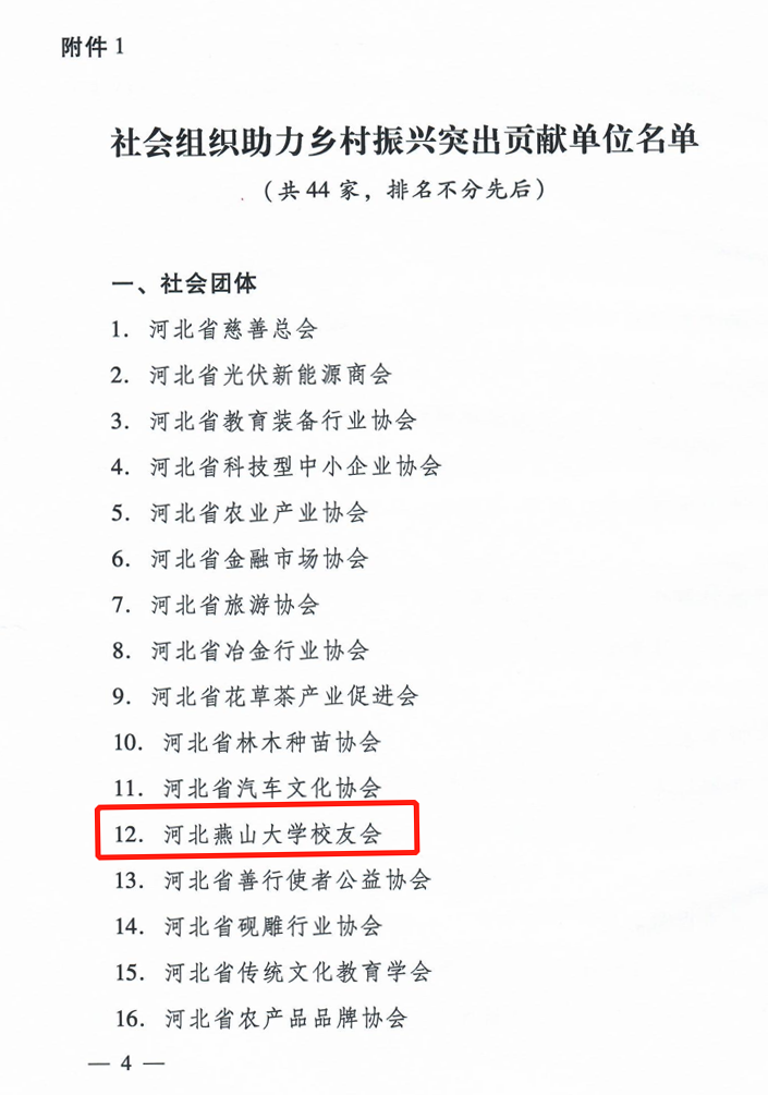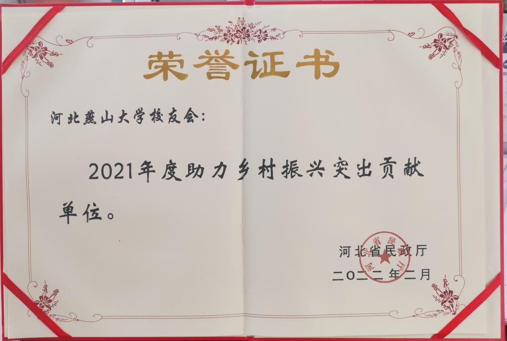 【新闻中心讯】为鼓励、支持人民团体、社会组织、企事业单位等社会各方面参与乡村振兴促进活动,2021年11月,河北省民政厅社会组织管理局开展了省属社会组织助力乡村振兴项目评选工作。经河北省民政厅的公开评选,我校报送的项目受到了专家的充分肯定,校友会被授予“社会组织助力乡村振兴突出贡献单位”称号。