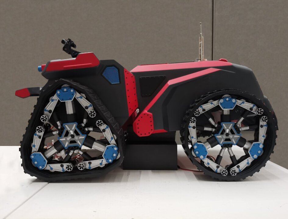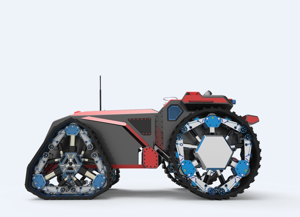 本产品是基于轮履的重构变形和智能侦查消防的消防机器人设计。主要通过轮履结构的重塑变形,解决在森林霍山路难以行走的地段,灵活通行等问题。增加机械臂结构移动障碍物辅助通行侦查摄像头带有自动收缩功能,在大火时能自动缩进内部,保护摄像功能不受损害。前端带有自动避障与激光指引系统指导受困人员火场逃生。发生火灾救援前的侦查以及发生火灾后救援过程中的侦查三个维度,配合林场守林员和消防人员,及时发现和消除森林火灾。通过系统地研究轮履形态重构的机械结构设计形式,引导设计创新、提出设计方案,以实现轮履形态自由切换。适用于消防人员、救援队、守林看护员等人员或机构。轮履变形拥有高温环境、复杂地形条件下的移动能力。协助消防替代消防人员进行火场情况勘测,寻找受困人员。利用物联网技术,使所有在同一火场的消防侦查机器人能够信息互联,组成智能侦查网络,共享火场信息,从而形成消防侦查系统;依据通信网络、通讯系统,一边感知故事现场环境信息,一边实时向上层控制单元传送,从而可以为指挥员和消防战士之间、看守员等人员更加迅速地提供全面而准确的事故现场等环境信息。