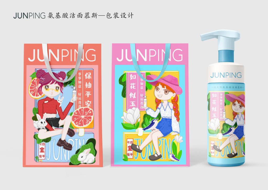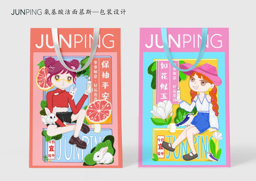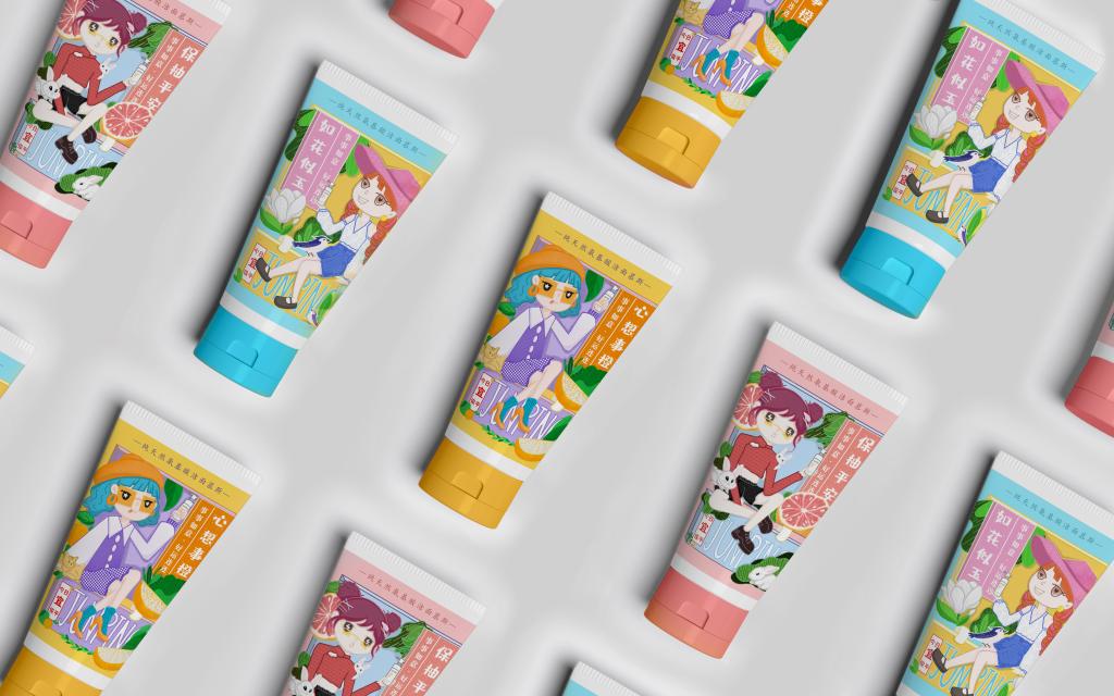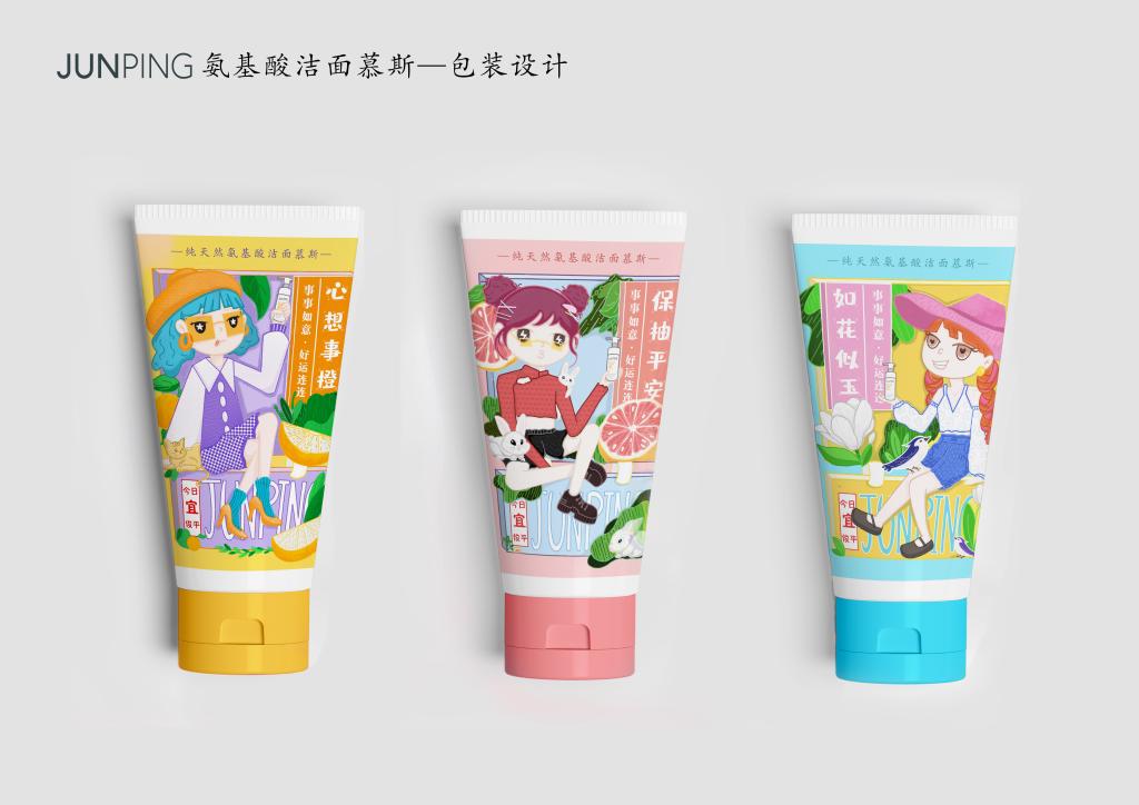 本系列以产品本身原材料为主题,进行红、蓝、橘三个色系进行包装设计。风格的卡通人物清新可爱,颜色活泼靓丽符合当代女性青年潮流审美。