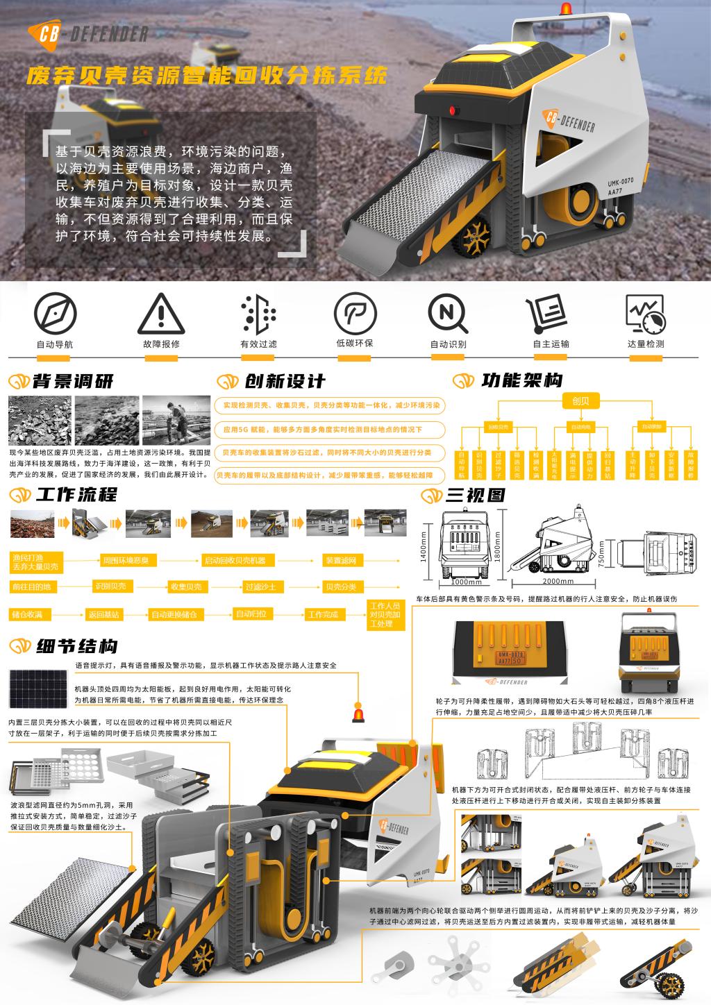 目前,我国对于贝类产品的加工仅仅只局限于其可食用部分,壳体部分则不再进行二次处理,直接进行遗弃,不仅造成了巨大的土地及物质资源浪费还污染生态环境。为解决该问题,我们设计了废弃贝壳资源智能回收分拣系统,应用5G 赋能,能够多方面多角度实时检测目标地点的情况,实现检测贝壳、收集贝壳,贝壳分类等功能一体化。车体收集满后,自动返回基站,两侧液压杆带动车体升高,履带可进行柔性伸展,机器下方开合,完成自动更换分拣箱功能。收集到的废弃贝壳可磨成贝壳粉进行手工画制作或应用于涂漆材料。产品机身材料为复合型材料,有轻质、高比强度比模量等特性,主要由铝、钢板、碳纤维等材料制成,履带为特殊钢材,附件密封圈为橡塑材质,为环保产品,具有很强前瞻开拓性。绿色环保,环境保护是重要的同时也是全社会人民最关注的,本产品在制作材料上使用无污染低碳材料,功能上实现废弃资源再利用,改善恶化了的海滩环境,还原海滩魅力风景,为促成海滩旅游业创造机会,创造了良好的社会效益。