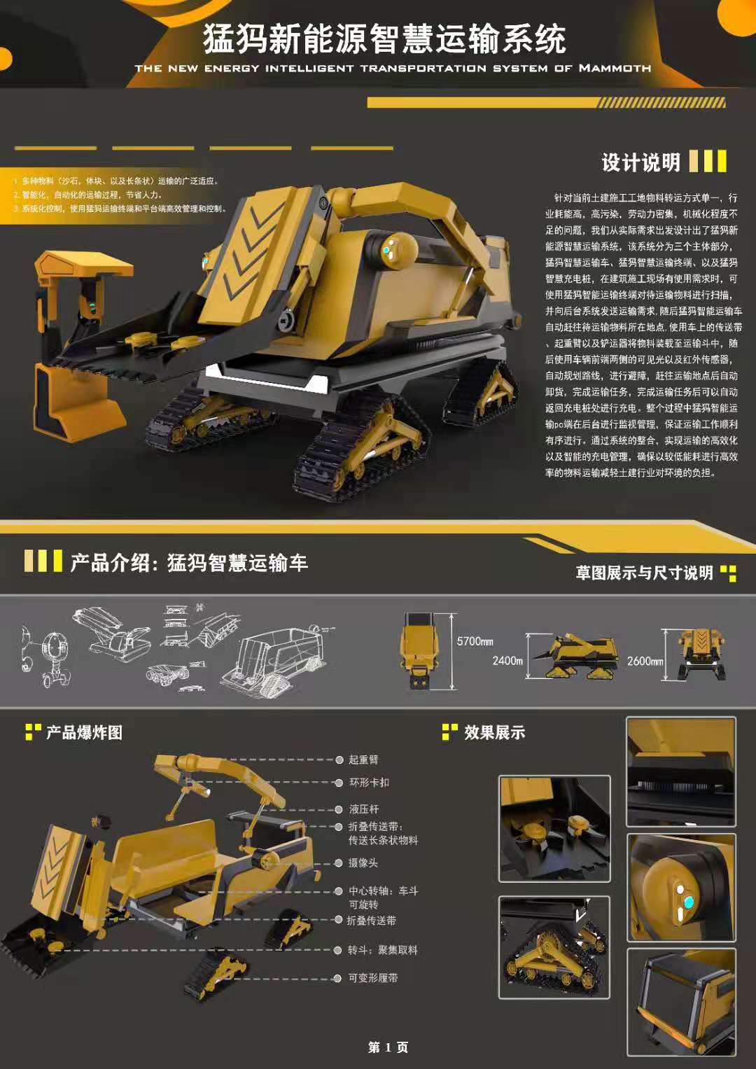 针对当前土建施工工地物料转运方式单一,转运困难,机械化程度不足的问题,我们从实际需求出发设计出了,猛犸智能运输系统,该系统分为三个主体部分,猛犸智能运输车、猛犸智能运输终端、以及猛犸智能充电桩,在建筑施工现场有使用需求时,可使用猛犸智能运输终端对待运输物料进行扫描,并向后台系统发送运输需求,随后猛犸智能运输车自动赶往待运输物料所在地点,使用车上的传送带、起重臂以及铲运器将物料装载至运输斗中,随后使用车辆前端两侧的可见光以及红外传感器,自动规划路线,进行避障,赶往运输地点后自动卸货,完成运输任务,完成运输任务后可以自动返回充电桩处进行充电。