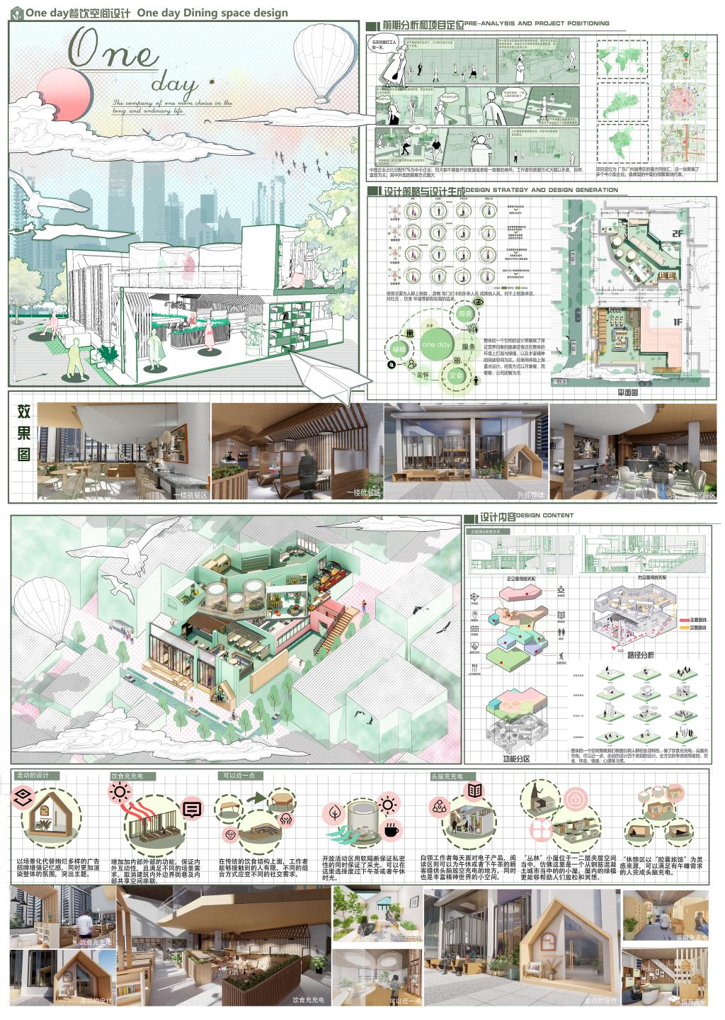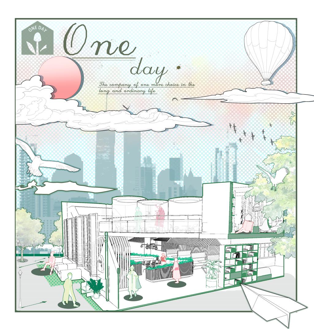本方案是为城市当中的白领工作者打造的餐饮空间设计,在当代的生活节奏下,外卖等就餐方式是上班族的首选。是one day以工作室的健康、心理、等等为基础。以营养定食为主要经营项目。同时为工作者提供午休和下午茶等服务,旨在管理好工作者的身体与心理健康为主,致敬普通人的”一天”。在空间的设计手法上我们尝试了子母空间,内外空间互动,场景化设计,夹层空间实验设计等等的创新。希望我们one day能够成为我们平凡普通的生活中多一个选择的陪伴。