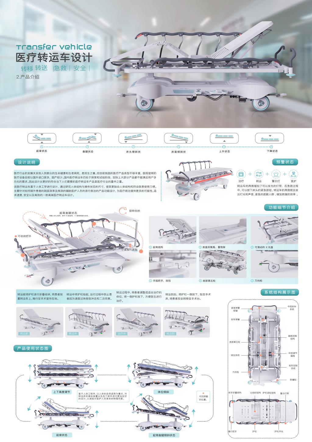 医疗行业的发展关系到人民群众的生命健康,生老病死是民生之重。但目前我国的医疗产品类型不够丰富医院使用的医疗设备目前以国外进口居多,国产较少国内医疗转运车仍处于探索和试验阶段,实际上大部分产品都不能满足用户多元化的需求。因此设计出更好的符合当下人们需要的医疗转运车产品是医疗行业的重中之重。 该医疗转运车基于人体工学进行设计,通过研究人体结构与操作状态的尺寸,使其更贴合人体结构和符合医患使用习惯。转运车的主要功能有预警功能、起背起腿、高度调节、体位倾斜等;整体造型采用拥抱感的方式,给人一种安全感;床的两侧设有预警灯带,在紧急状况下便于疏散人群;左右两侧的护栏和床头的推行把手都带有弧度造型,方便抓握,在不使用的状态下可以折叠,节省空间;床板微微凹陷,并结合人体结构进行弧度设计;底盘设有放置双氧瓶及医疗用品的位置,床位设有放置医疗器械的小桌板,方便医护人员在救治过程中使用。各个结构功能部分模块化设计,整体造型简洁,可落地性高。