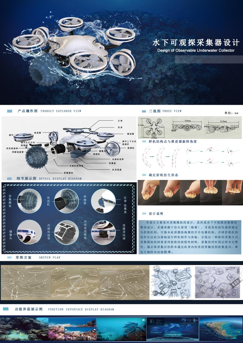 本设计主要是对采集模块的设计,其次是水下可观探采集器的整体设计。灵感来源于仿生原型(海葵),寻找其相似性最终确定为折纸机构,可基本还原模拟海葵的开合包裹机制,并将折纸机构的骨架提取出来连杆化以此为基础进行样机制作与实验,呈现出一种新的采集方式。采集模块的材质采用较软的硅胶性材料,采集的同时保证样本完整性,最后将采集后的样本通过机身内的传送带输送到收集盒内,降低生物样本的损伤率。