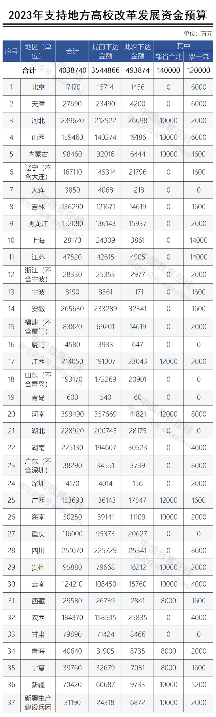 2023年支持地方高校改革发展资金预算表如下: