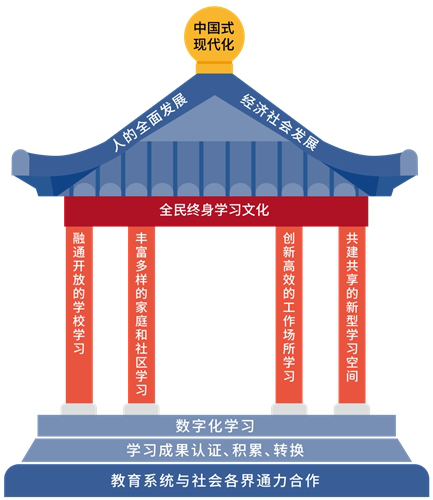 答:《任务》部署建立在学习型社会图景的绘制基础之上。经综合分析我国经济社会发展水平、人口规模结构变化和教育强国建设进展,参考联合国教科文组织的学习型城市关键特征框架,我们设计了以中国亭子为原型的学习型社会图景。