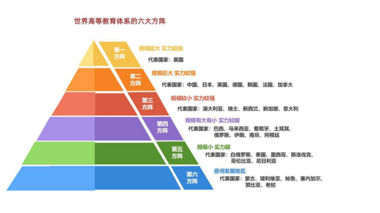 数据显示,世界高等教育体系根据发展阶段可分为六大方阵,美国以绝对实力领跑,中国、日本、英国、德国等国家为第二方阵的代表国家。尽管中国在第二方阵中领先,但和美国仍有不小差距,“高等教育强国指数”显示美国的得分为100分,而中国仅为58分。