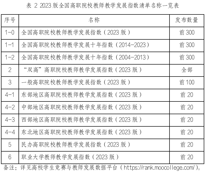 本次发布的全国高职院校教师教学发展指数的一级指标包括“教师团队”“产教融合”“专业与课程”“教材与论文”“教学成效”“教学组织”六个维度和“教学竞赛”特别维度,调整2个二级指标、7个三级指标,与本科“教学成效”指标调整方式相一致,此外新增6个三级指标,新增数据量6万7千余条,总数据量达42万余条。