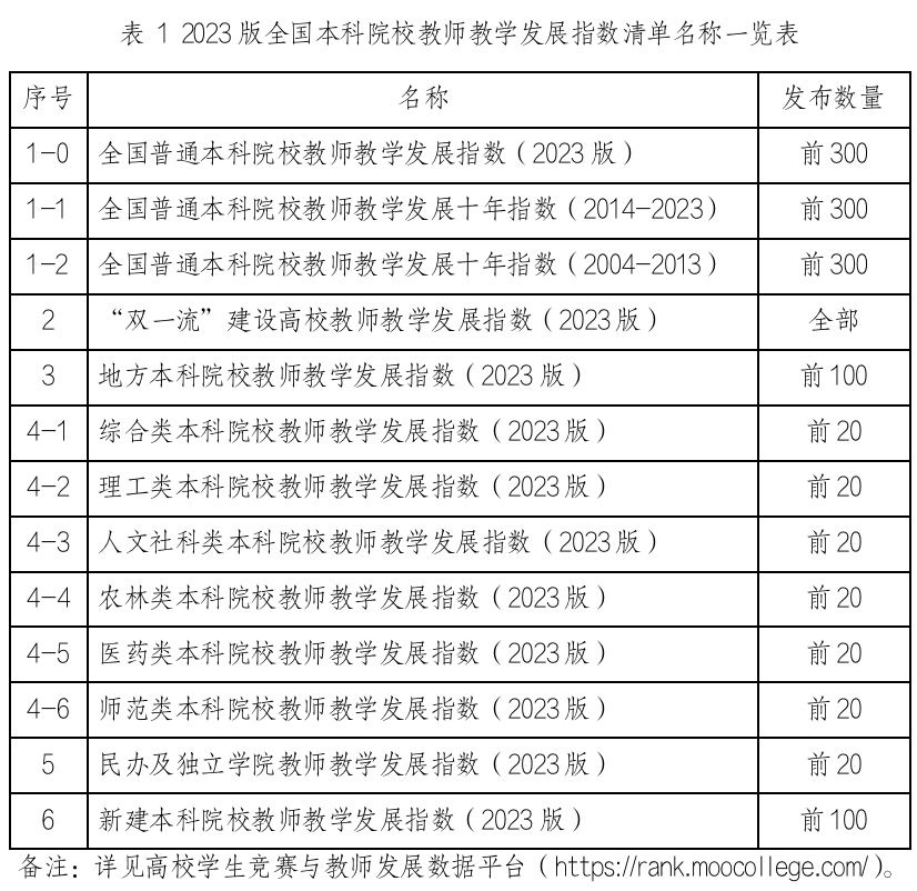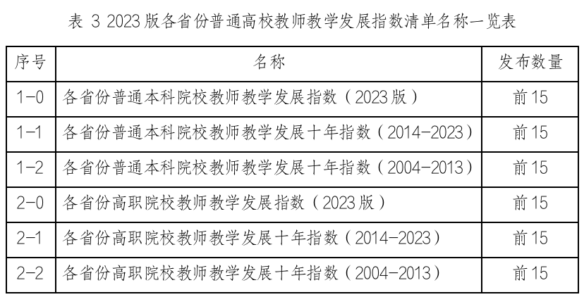 此次发布的2023版指数,数据采集起始于1989年,包括“全国本科院校教师教学发展指数”和“全国高职院校教师教学发展指数”。其中,本科院校教师教学发展指数包含13个指数清单,高职院校教师教学发展指数包含11个指数清单。同时发布各省份普通高校教师教学发展指数,分为本科院校和高职院校两大类。