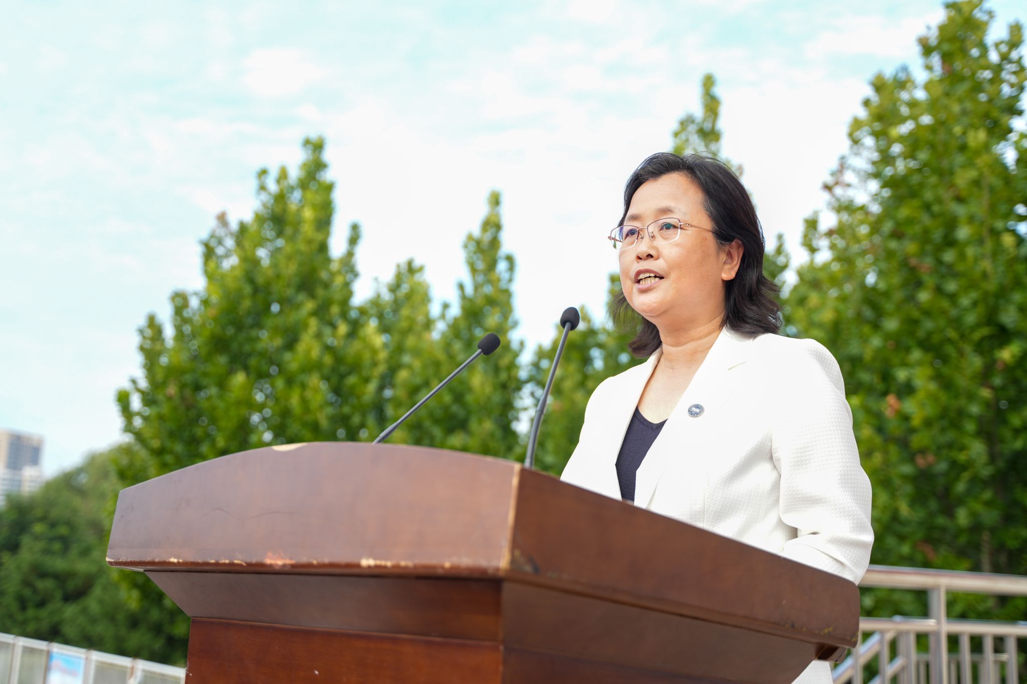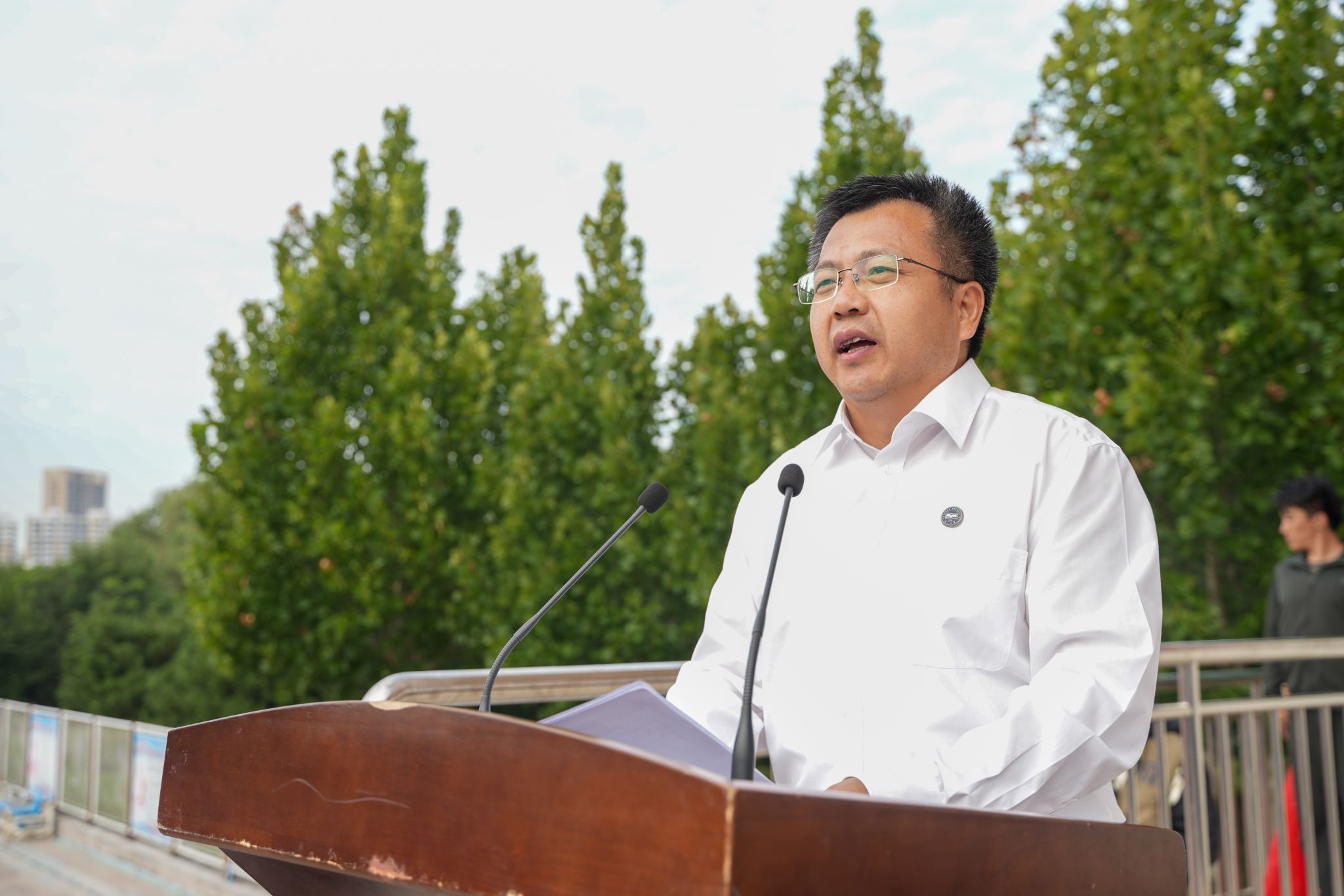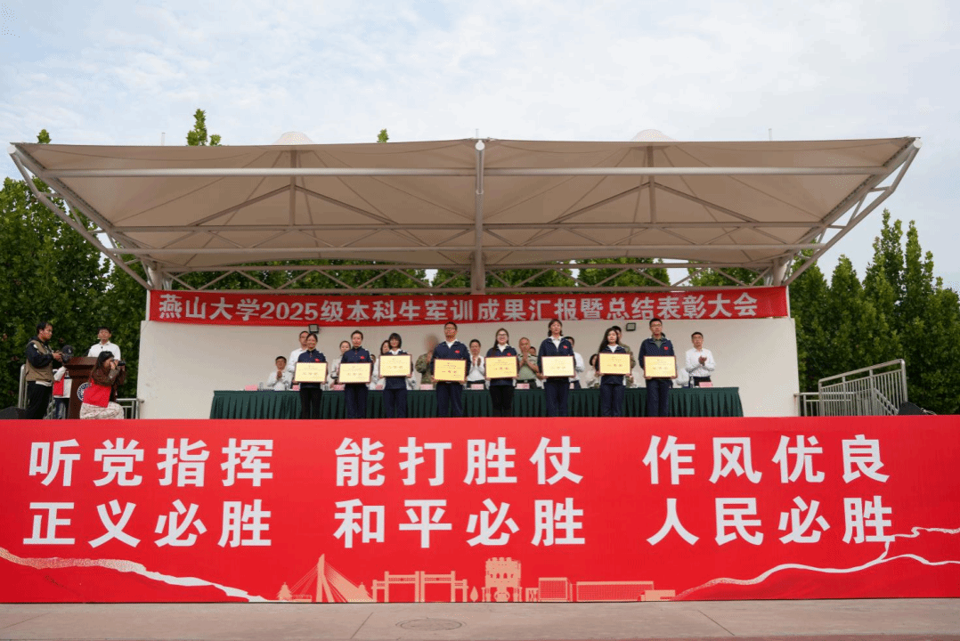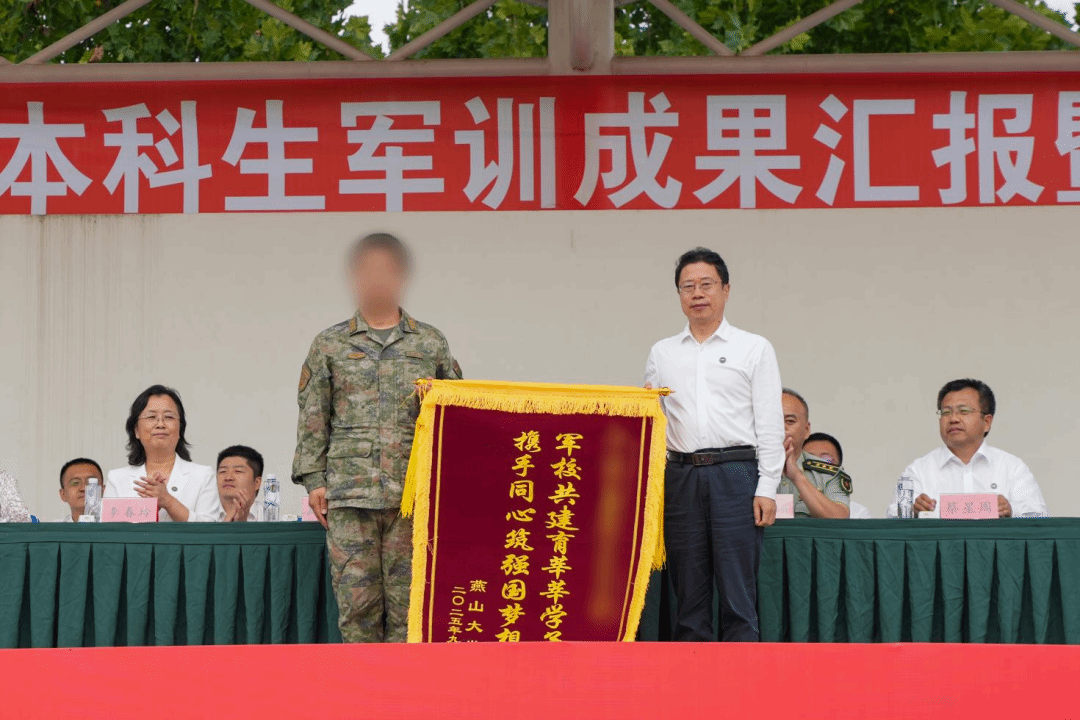 校党委副书记蔡星周作军训总结讲话。他向完成军训任务的全体同学表示热烈的祝贺,对市军分区和承训部队的大力支持、对全体教官的科学组训和辅导员的贴心守护表示衷心的感谢。他提醒同学们,不能忘记94年前东北夜空的炮响、山河破碎的苦难与先辈的抗争,时刻警示我们“忘战必危,忘史必亡”;号召同学们在新时代要增强国防意识,践行国防责任,作为新一批的燕大人,更应传承校史荣光、锚定时代坐标,以青春之力扛起使命担当,在强国征程中书写属于新一代燕大人的答卷。同学们齐声高呼三遍“听党指挥!能打胜仗!作风优良!”“正义必胜!和平必胜!人民必胜!”回应校领导殷切嘱托。