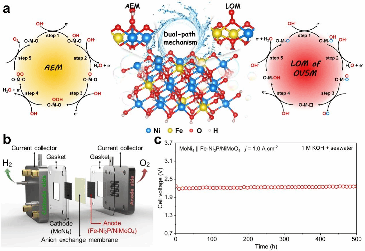 在电化学性能测试中,得益于单一活性相中AEM-LOM双路径共存机制,活化后的电催化剂在碱性淡水和海水中分别仅需274.5和299.1 mV的过电位即可驱动1.0 A cm-2的工业级电流密度,并在1.0 A cm-2下稳定运行1000小时(碱性淡水)和500小时(碱性海水),表现出优异的催化活性和耐久性。装配于阴离子交换膜电解槽后,在1.0 A cm-2下持续电解海水500小时,性能无明显衰减,表明其在工业电解水制氢中的巨大应用潜力。这项成果不仅为非贵金属催化剂提供了“双机制耦合”的新设计范式,也为我国绿氢产业迈向“海水直供、设备长寿命”的工业目标提供了关键支撑。