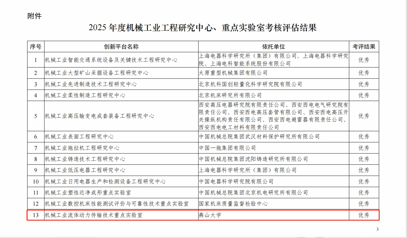 【新闻中心讯】近日,中国机械工业联合会发布了2025年度机械工业工程研究中心、重点实验室考核评估结果,依托乐竞(中国)一站式服务官网建设的机械工业流体动力传输技术重点实验室、机械工业大型件塑性成形技术重点实验室和机械工业并联机器人及装备基础重点实验室三个重点实验室均顺利通过考核,其中机械工业流体动力传输技术重点实验室获评优秀。