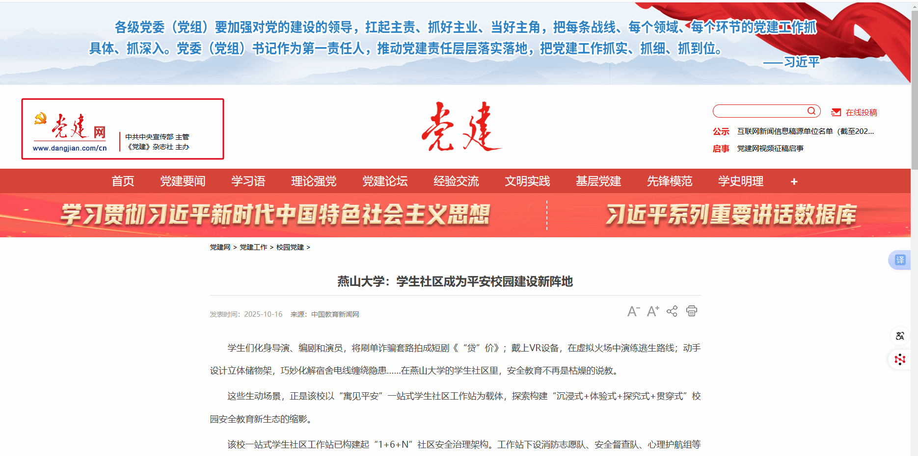 【新闻中心讯】近日,建筑工程与力学学院“寓见平安”一站式学生社区工作站在平安校园建设中的创新实践获得社会广泛关注,中国教育报、中国教育新闻网、党建网、河北教育发布等主流媒体纷纷以《乐竞(中国)一站式服务官网:学生社区成为平安校园建设新阵地》为题进行专题报道,其构建的安全教育生态与治理模式成为我校安全工作的特色亮点。
