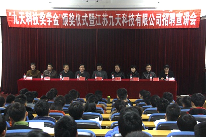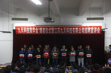 最后,陈革新副书记宣读获奖名单,此项奖学金设立特等奖1名,8000元/人/年;一等奖8名,4000元/人/年;二等奖10名,3000元/人/年;三等奖20名,1500元/人/年。在热烈的掌声中几位领导为获奖的学生们颁发了荣誉证书和奖金。获奖学生代表发表了获奖感言。颁奖仪式结束后,九天光电科技有限公司进行了招聘宣讲会。