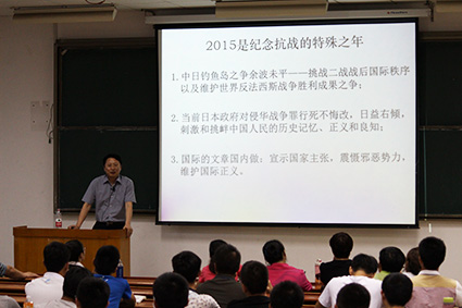 刘永志老师从2015年这一特殊历史时期的重要意义入手,介绍了在抗日战争胜利70周年之际我国面临的复杂外交局势和国内舆论呼声。在分析国共两党抗战的表现及效果时,刘老师援引战略防御、相持和反攻三个阶段的具体事例对其进行了详细客观的比较;同时也深刻剖析了国共两党在抗战中的作用,充分肯定了中国共产党在其中的地位,并对其中的某些历史问题进行了梳理。刘老师表示,中国共产党是抗战的中流砥柱;对于抗战的教训与启示我们应该予以足够的重视。刘老师的讲述风趣幽默,不时引来阵阵欢笑;对待历史问题时严肃认真的态度得到了同学们的一致赞同。在师生问答环节,刘老师对同学们提出的问题进行了耐心的解答,赢得了现场师生的热烈掌声。