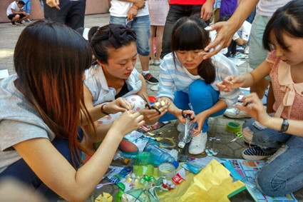 在奔腾艺术团精彩的歌舞声中,活动拉开了帷幕。本次活动共分为创意构思、作品创作及个性展示三个环节。活动现场,各组同学激烈讨论,争先恐后地提出自己的创意,在确定本组的改造方案后,经过一小时的通力协作,一个个废旧水瓶、废旧瓶盖在同学们别出心裁的创意中变成了象棋、小火车和五颜六色的花朵等等。在最后,各组代表用独具创意的形式展示了自己的作品,现场观众不时发出由衷地赞叹,大家在欢笑中体会到了变废为宝的力量。