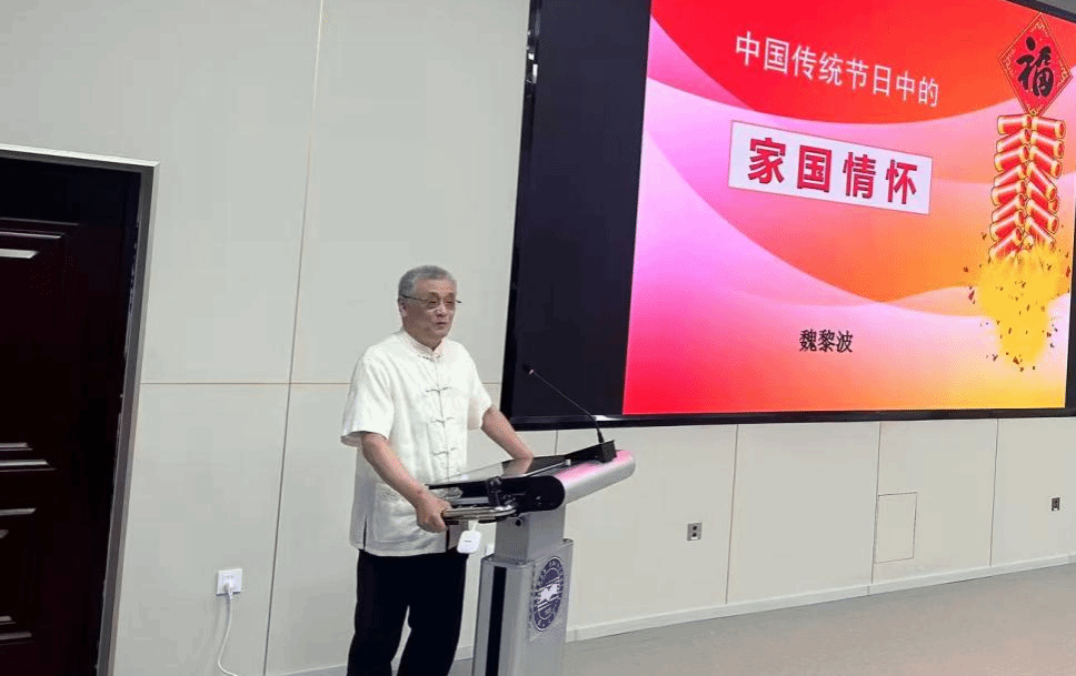 讲座伊始,魏黎波教授以即将到来的端午节为切入点,指出中国传统节日是中华文明的重要载体,凝聚着中华民族的家国情怀与文化认同。他系统梳理了端午节、清明节、中秋节及春节的起源与演变,结合端午祭龙、寒食节与介子推传说、中秋祭月等习俗,阐明传统节日中蕴含的“忠孝仁义”精神。随后,魏教授从历史与现实维度展开论述。通过抗美援朝“冰雕连”战士宋阿毛的绝笔信、黄继光舍身堵枪眼等英雄事迹,展现了中华儿女“保家卫国”的赤诚担当;结合白方礼十多年蹬三轮资助贫困学生、孟佩杰背母求学等当代事例,诠释了“老吾老以及人之老”的伦理传承。针对春运现象,魏教授深度剖析道:“90亿人次跨区域流动的背后,是‘团圆文化’驱动下的集体精神共鸣,更是中华文明‘家国同构’特质的生动映照。”在探讨文化自信与民族复兴时,魏教授援引《大学》“修身齐家治国平天下”的思想脉络,指出社会主义核心价值观与传统文化的高度契合。通过解读梁启超《少年中国说》中“少年中国”的愿景,以及中共中央关于文化建设的论述,他提出:“祖先崇拜与家国情怀构成中国人的精神坐标系,既守护文化根脉,又激发奋进力量。这种文化基因,正是中华民族伟大复兴的精神引擎。”讲座尾声,魏教授以联合国前官员特维叟·莱特的评价作结:“当西方讨论‘中国人是否有信仰’时,他们忽视了中国人对祖先与故土的永恒信仰——这种信仰让中华文明历经五千年风雨而生生不息。”