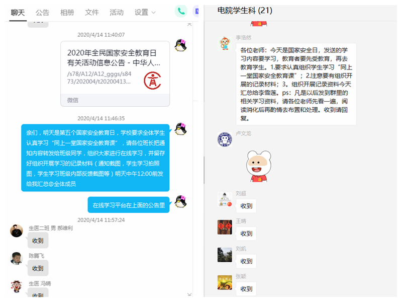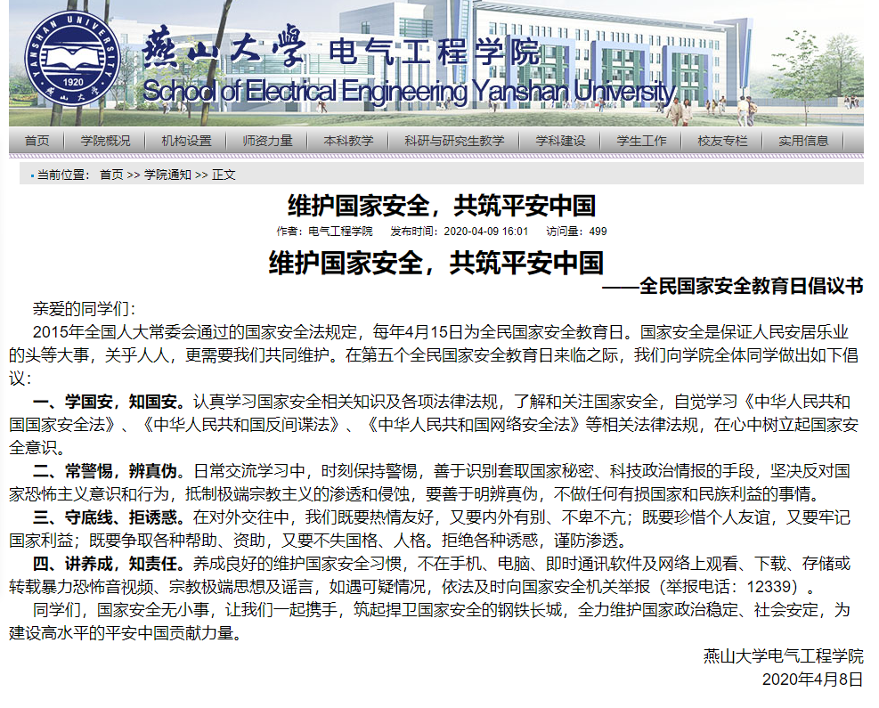 一、精心制定方案,广泛宣传展播。电气工程学院充分利用校园新媒体,通过网站、公众号、QQ群、微信群等多种形式全方位开展宣传教育活动,重点宣传国家安全教育日的概况、危害国家安全的典型案例、邪教的本质及危害、维护国家安全等内容,在线上积极营造浓厚宣传环境,使广大师生普遍接受国家安全教育。