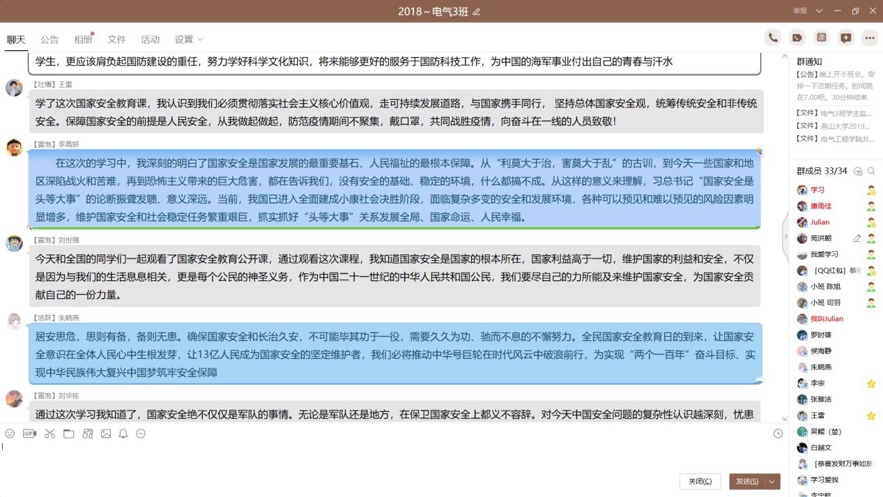二、学习法律法规,聆听专题讲座。组织全体学生以班级和党支部为单位,集中学习《中华人民共和国国家安全法》、《中华人民共和国反间谍法》、《中华人民共和国网络安全法》等法律法规,并结合当前新冠肺炎疫情防控工作,学习了公共卫生安全、生物安全等非传统安全内容。4月14日,4月15日,电气工程学院组织全体同学共同参与“千万学生同上一堂国家安全教育课”活动,4900余名同学在线进行了“总体国家安全观视角下的疫情防控”的学习,并针对国家安全主题进行了广泛的思考和讨论。