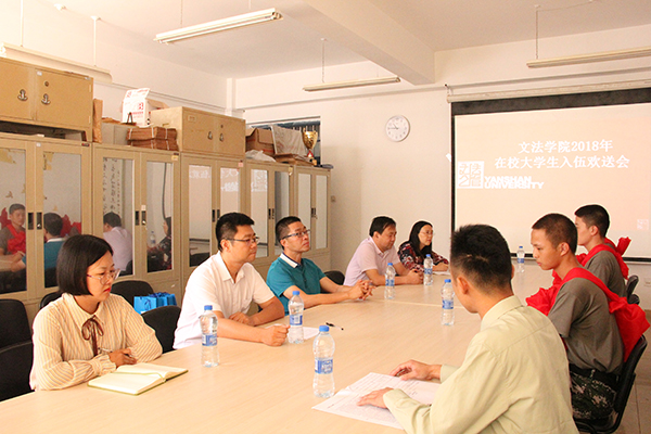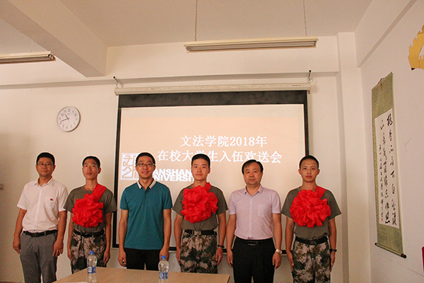 【新闻中心讯】2018年9月5日上午十点半,文法学院于人文馆218召开2018年在校大学生入伍欢送会。学院党委书记刘叶涛、副院长丛鑫、党委副书记杨健民,相关辅导员老师、入伍大学生到会,服役期满返校复学大学生张华春作为在校生代表参会并发言,会议由2017级本科生辅导员高原主持。