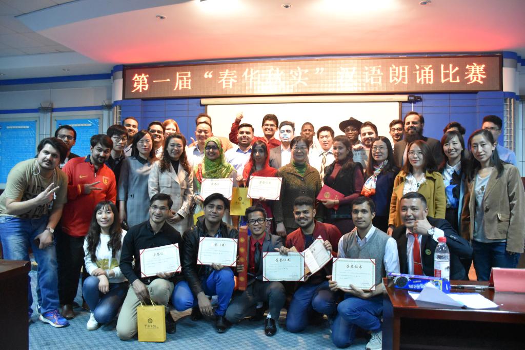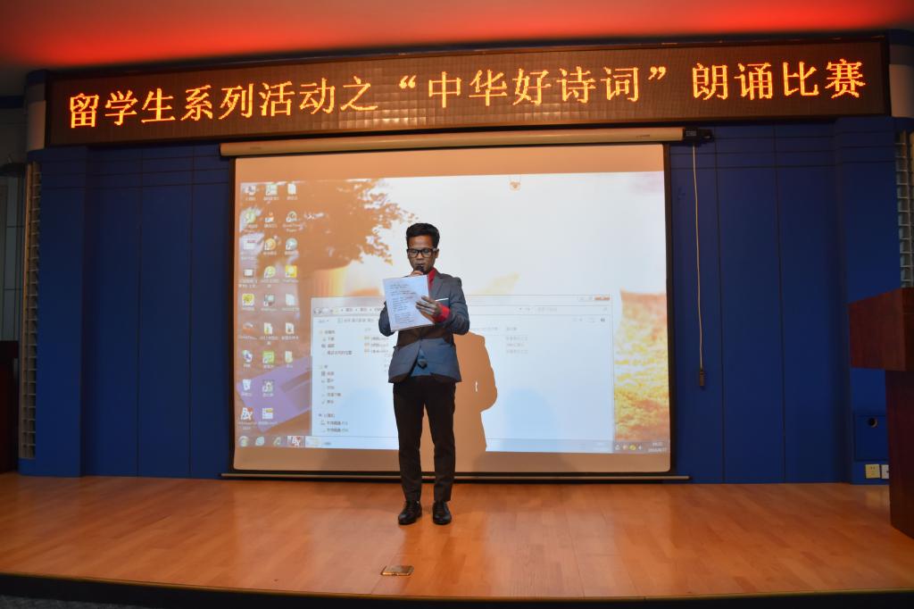 【新闻中心讯】4月27日晚7时,国际教育学院联合图书馆举办了第一届“春华秋实”汉语朗诵大赛,暨留学生系列活动之“中华好诗词”朗诵比赛。活动在图书馆718学术报告厅举行,在校留学生50余人参加了此次活动。