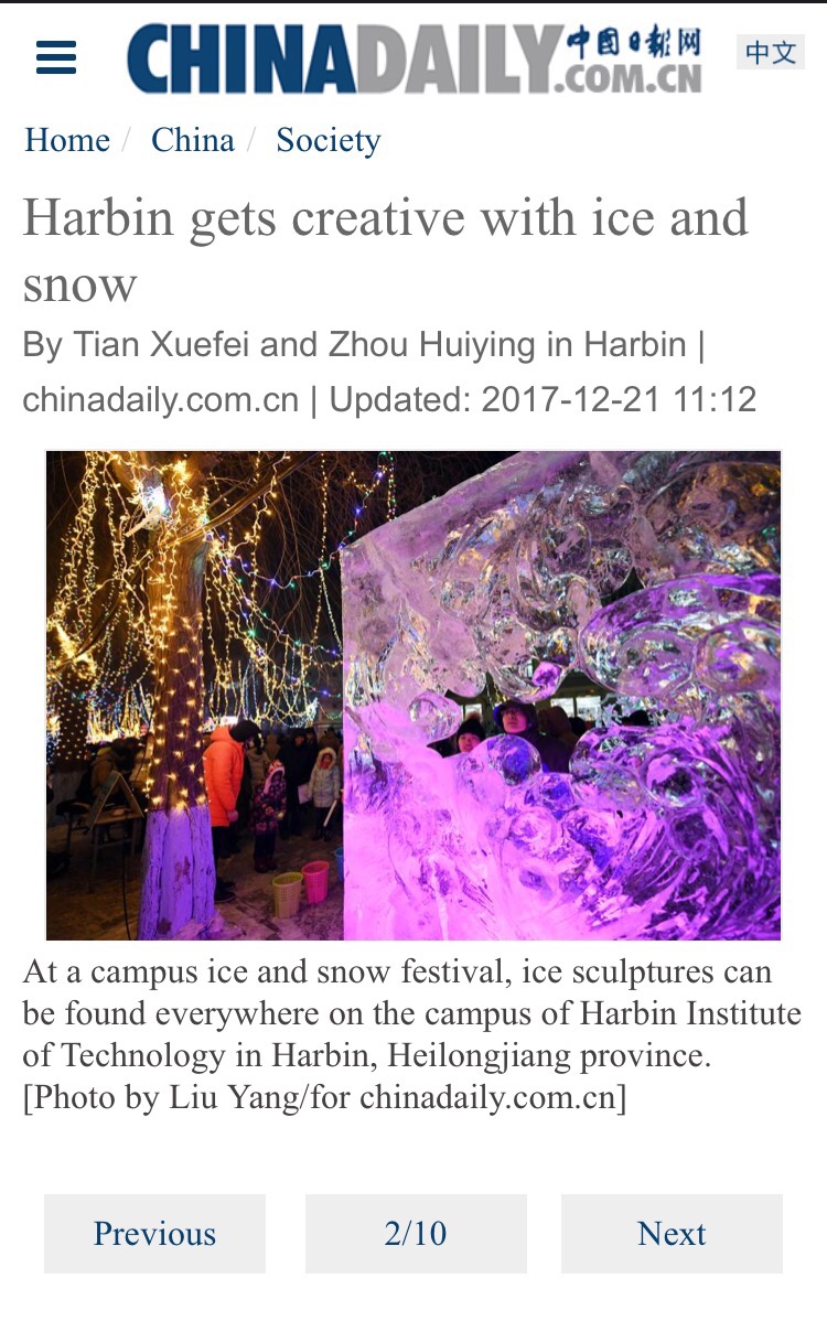 冰雕作品《飞扬·冰之梦》以“浪花”为题材,作品长1.5米,高1.8米,厚度0.5米,翻卷飞扬的浪花代表大学生灵动活跃的思维和青春激荡的梦想,图腾式的整体造型充满了奔腾不止的昂扬气势。该作品照片与大赛报道一起登上了《CHINADAILY》。