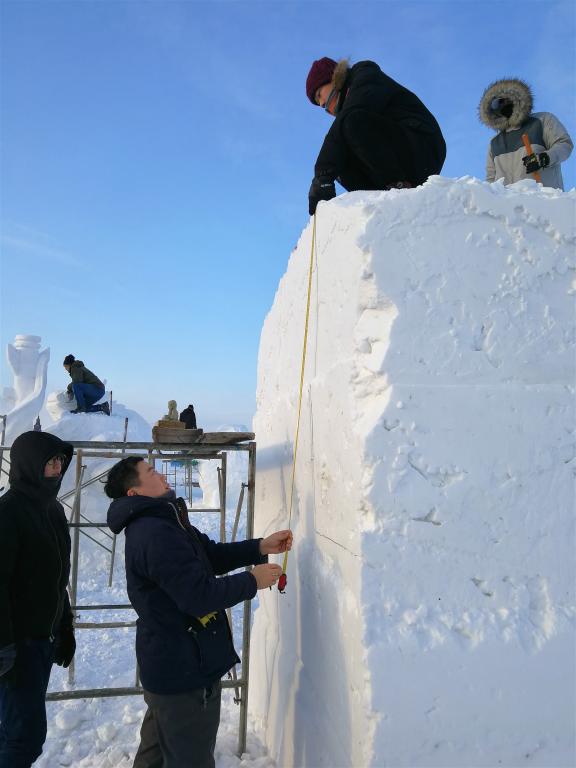 乐竞(中国)一站式服务官网艺术与设计学院参赛队伍由李鹏克、仇媛媛教师带队,雕塑系14级张章、朱开振、袁宵、宗宇石四名同学组成。队员们创作的热情战胜了-13℃至-24℃的严寒天气,顺利的完成了两项大赛的创作任务。