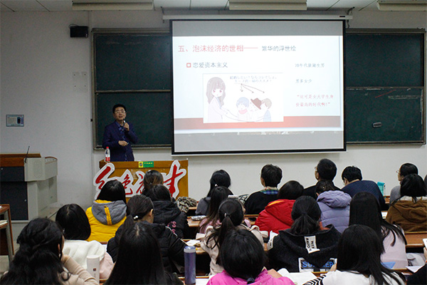 【新闻中心讯】11月23日晚7:30,由马克思主义学院主办,校团委、里仁学院协办,马克思主义研究会承办的第一百二十一期“红色旋律”讲坛在里仁阶梯教室J103举行,本期讲坛内容的题目是《泡沫经济的美妙与哀愁——穿越繁华之极限的现代日本》,由任文启老师主讲。