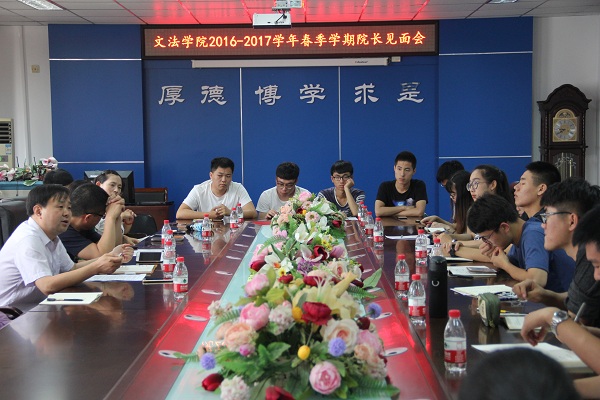 【新闻中心讯】6月29日下午15:30,文法学院2016—2017学年春季学期院长见面会在人文馆224室召开。文法学院党委书记刘叶涛、副院长丛鑫,学生科科长金宏妍、团委副书记王奕骅以及文法学院各年级学生代表参加了本次见面会。