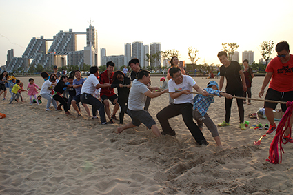 已经举办了三届的沙滩运动会以趣味性为主,竞技性为辅,目的是让所有的老师、同学都能暂时放下教、学的压力,全身心参与活动,感受大自然的无边魅力和师生之间的款款深情。本次沙滩运动会以热闹的拔河比赛开局,分为两组,全员上阵,大人在前,孩子在后,大家全情地投入,兴奋地呐喊,既都是参与者,又都是拉拉队。(编辑 蔡巧怡)