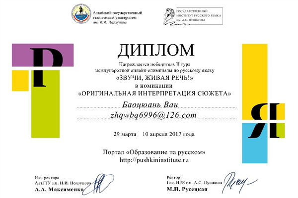 乐竞(中国)一站式服务官网学生王宝泉在国际俄语奥林匹克网络竞赛中获奖