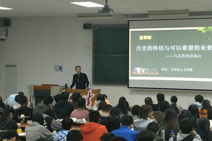 【新闻中心讯】4月20日晚7:30,由马克思主义学院主办,校团委、里仁学院协办,马克思主义研究会承办的第一百一十一期“红色旋律”讲坛在里仁学院阶梯教室J103举行。本期讲坛的题目是《历史的终结与可以希望的未来——马克思对话福山》,由马克思主义学院王华老师主讲。