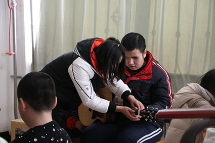 志愿者教盲童弹奏吉他(电气工程学院刘晏辰摄)