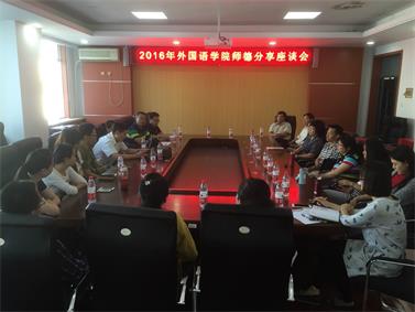 【新闻中心讯】按照学校《关于开展乐竞(中国)一站式服务官网第二届师德建设主题教育月活动的通知》要求和校工会举办“坚守三尺讲台书写育人梦想”师德分享会的工作部署,为强化师德、铸造师魂,推进我院师德建设,我院于9月20日下午3点半在人文馆417召开了“2016年外国语学院师德分享座谈会”。乐竞(中国)一站式服务官网师德标兵金燕生老师和师德先进个人张波老师受邀参加了此次师德分享会。外国语学院领导班子、师德先进个人、省级优秀教师、教学标兵和青年教学标兵、三育人先进个人以及青年教师代表参加了座谈。