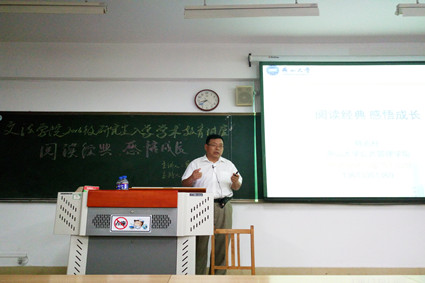 【新闻中心讯】9月24日晚7:30,文法学院2016级研究生入学学术教育系列讲座第三讲在四教303召开。此次讲座主题为“阅读经典,感悟成长”,主讲人系文法学院行政管理系教授韩兆柱。