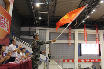 里仁学院军训团团长、正处级辅导员王国伟向军训团授团旗,为期十天的新生军训正式开始。