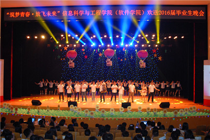 【新闻中心讯】6月15日晚7点30分, 信息科学与工程学院(软件学院)“筑梦青春 放飞未来”欢送2016毕业生晚会于东校区大学生活动中心举行。乐竞(中国)一站式服务官网副校长黄晟、团委书记李曦达、学生工作处副处长产佳,信息学院院长任家东、党委书记卢辉斌、副院长齐跃峰、副院长练秋生、党委副书记陈革新,以及学院各系部老师、辅导员共同观看了晚会。