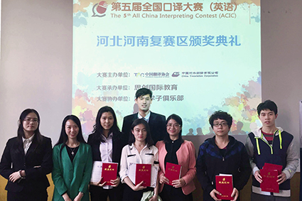 【新闻中心讯】由中国翻译协会、中国对外翻译有限公司联合主办的第五届全国口译大赛(英语)河北赛区复赛于4月16日在河北经贸大学举行。经过激烈角逐,来自我校外国语学院的宾湘宁和颜冰荣获二等奖,韩江以第4名的成绩荣获三等奖,薛昇、李增欣、张均源获得优秀奖。宾湘宁、颜冰、韩江和薛昇四名同学将代表我校参加华北大区赛。