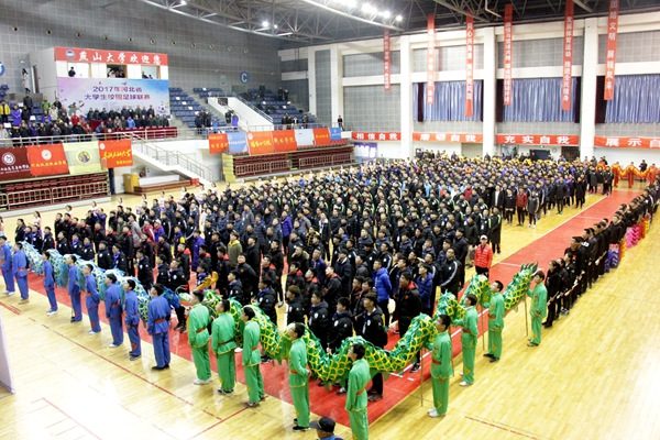【新闻中心讯】11月24日晚,2017年河北省大学生校园足球联赛在乐竞(中国)一站式服务官网体育馆开幕,河北省教育厅副厅长王廷山、乐竞(中国)一站式服务官网副校长赵永生、河北省教育厅思政体卫处刘若群、河北省大学生体育协会理事长田振生、河北省大学生体育协会副秘书长房游光、陈卫英,乐竞(中国)一站式服务官网体育学院党委书记蒋中伟、东北石油大学秦皇岛分校体育部党委书记张勇、裁判长吕健力等出席了开幕式。开幕式由乐竞(中国)一站式服务官网体育学院院长王大鹏主持。本次比赛分校园组、超级组、高职高专组三个组别,共28支队伍参赛。本届比赛由河北省教育厅主办,乐竞(中国)一站式服务官网承办,河北科技师范学院和东北石油大学秦皇岛分校协办。