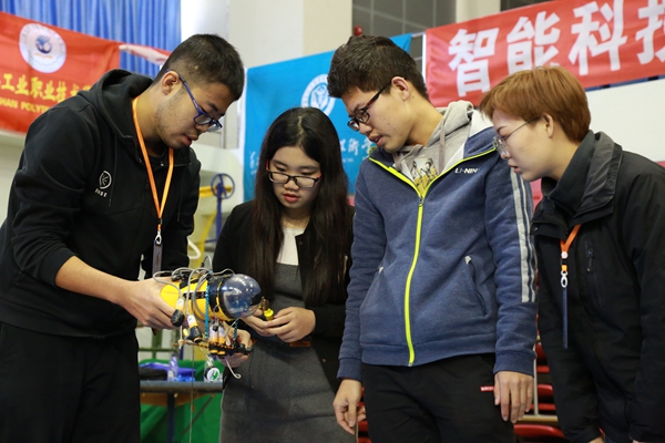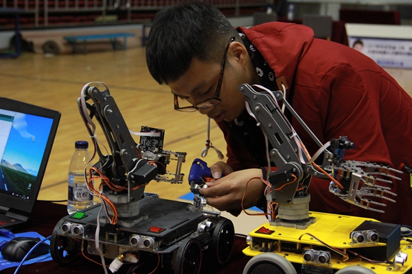 参赛人员调试智能物流机器人(吴欢悦/摄)