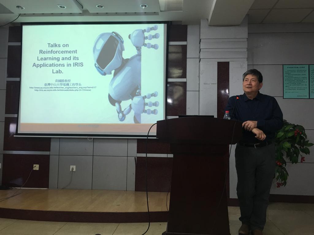 为了增加大赛的学术气氛,比赛组委会邀请了台湾系统学会理事、台湾机器人学会理事、台湾国立中山大学黄国胜教授做了题为“Talks on ReinforcementLearningand its Applications in IRIS Lab”的学术报告。整场报告中,黄教授将深奥的专业知识阐释得深入浅出、精准且全面,幽默生动的风格也令在场的老师和同学们印象深刻、回味无穷。会后,黄教授又就机器学习的相关问题与大家进行了亲切的交流。