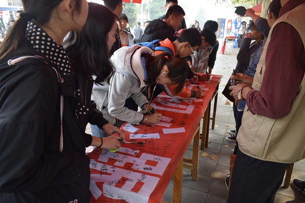 同学们在条幅上签字
