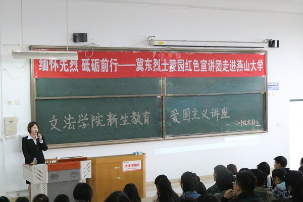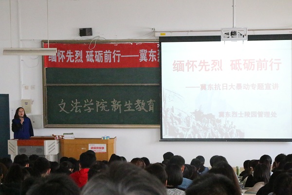 【新闻中心讯】10月28日上午9:30,“缅怀先烈 砥砺前行——冀东烈士陵园红色宣讲团”一行走进乐竞(中国)一站式服务官网,本次讲座由乐竞(中国)一站式服务官网文法学院主办,冀东烈士陵园红色宣讲团的刘力勤、张乐陶、张艳明老师主讲,肖杨老师主持。文法学院2017级本科生于东校区第四教学楼309教室认真聆听讲座。