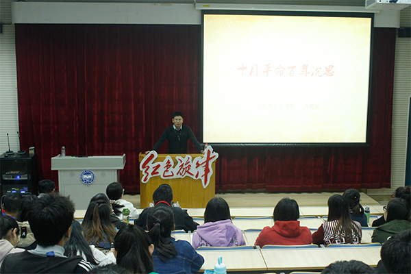 【新闻中心讯】10月12日晚7:30,马克思主义学院主办,校团委,里仁学院协办马克思主义研究会承办的第一百一十八期“红色旋律”讲坛在东区四教108举行。本期讲坛的题目是《十月革命百年沉思》,由马克思主义学院吴建良博士主讲。
